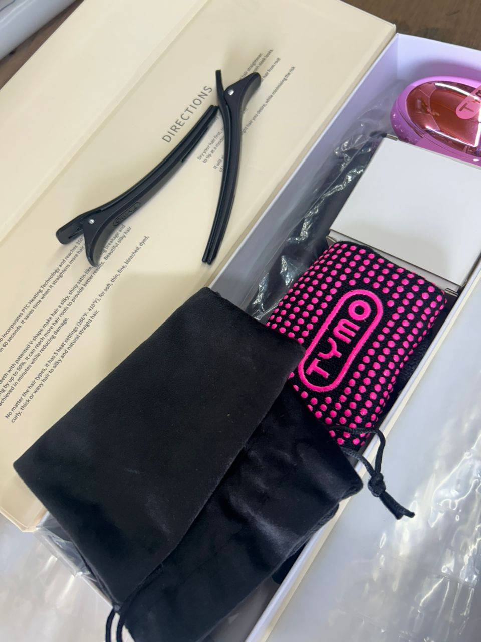 We aim to provide you with all the tools you need for a superior styling experience. Along with the straightener brush, you’ll get a heat-resistant glove, a velvet silk bag, a detangling brush, and two large hair clips—all essential for achieving a professional blowout as well as for hairstyling and makeup application.